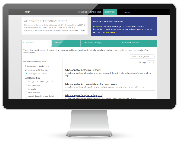 Funded by the Small Business Innovation Research program at the U.S. Department of Education’s Institute of Education Sciences, IvySCIP assesses five key social competencies: self-knowledge and self-advocacy, social interaction, emotional regulation, executive skills and problem solving, and self-care. Reports generated from the assessment help educators prioritize instruction, develop Individualized Educational Programs (IEPs), and track student progress toward meeting goals.