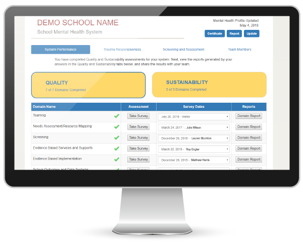 The School Health and Performance Evaluation System, or the SHAPE System, is a free resource that helps educators measure the quality and sustainability of their mental health programs as well as their level of trauma responsiveness. The data collection informs planning and implementation of school-wide mental health services.
