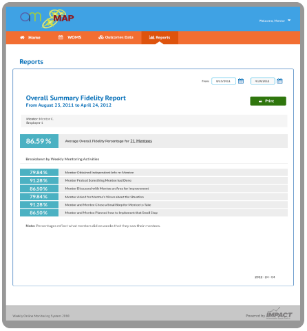 Dr. Brenna Bry chose Impact to replace a system currently used to collected fidelity data for AM/MAP, She selected Impact for the ability to customize the support system to meet the needs of the AM/MAP intervention, and for its robust data collection and reporting capabilities.