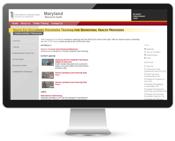 MDBehavioralHealth.com is an online training site hosted by the Department of Psychiatry at the University of Maryland School of Medicine. The site provides online training in a wide variety of topics to individuals interested in supporting the behavioral health of youth and their families.
