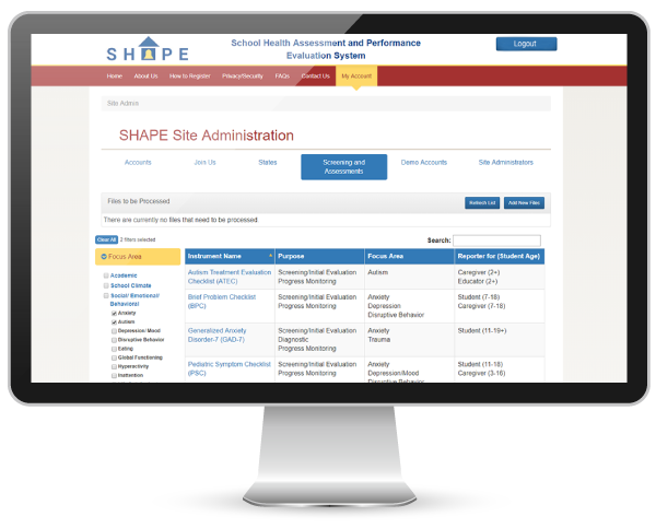 The School Health Assessment and Performance Evaluation System (SHAPE System) site offers free, targeted resources to schools and school districts to help advance school mental health quality and sustainability. Users of the SHAPE resource center can sort resources by topic to hone in on specific quality, sustainability, and trauma goals.