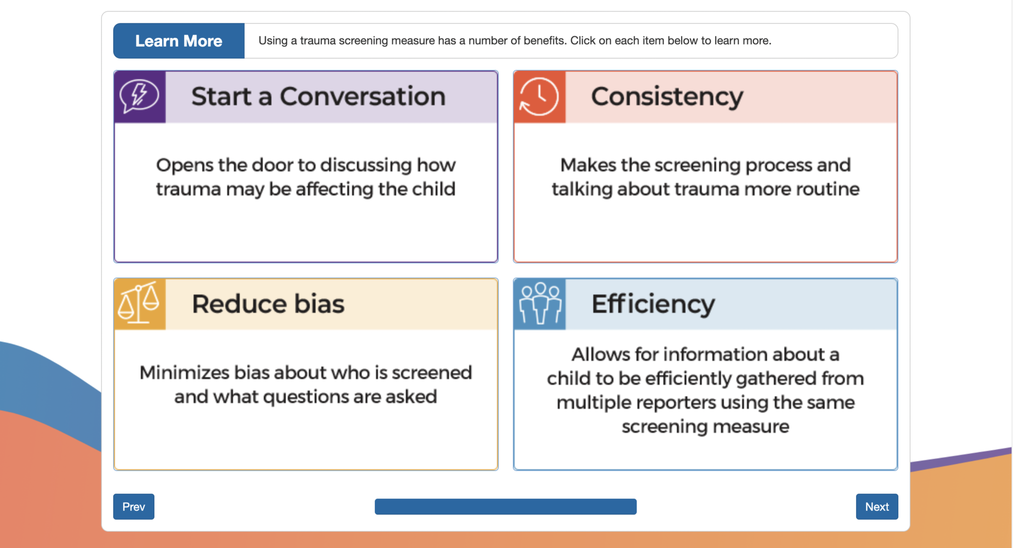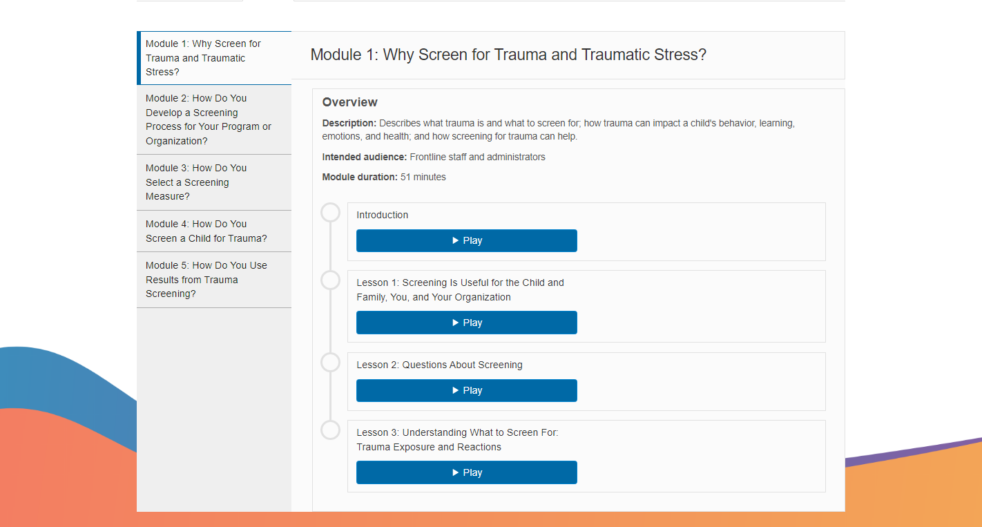 Trauma ScreenTIME guides professionals through this complex process through its core course consisting of five self-paced modules. Each module centers on an important question: